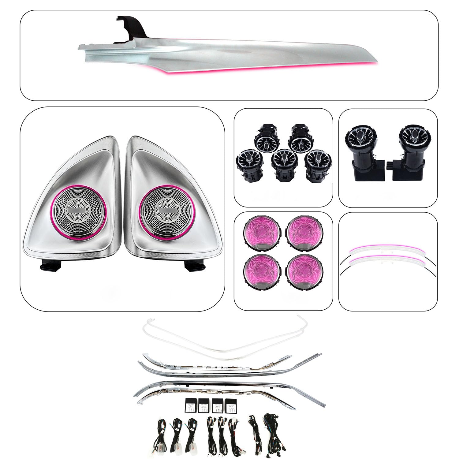Quantity: 5pcs front air vent LED lights +2pcs back air vent LED lights+4pcs speaker cover+2pcs 4D rotary tweeters,driver and passenger light,rear seat light,4 doors handrail LED lights ,central saddle led light, 4pcs footwell led lights